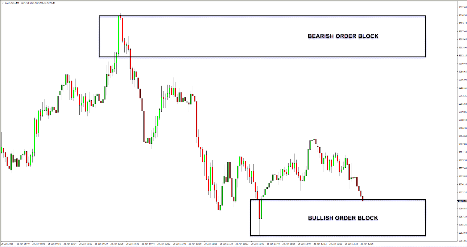 Secara teknikal kita bisa melihat order block itu di area swing high atau swing lownya dengan lebih spesifik seperti berikut ini :