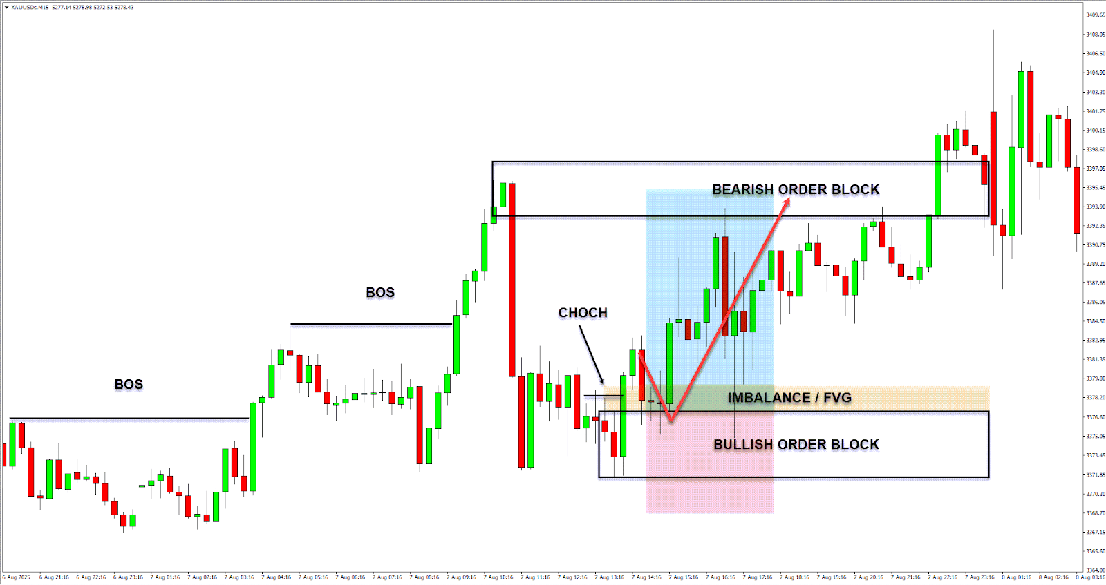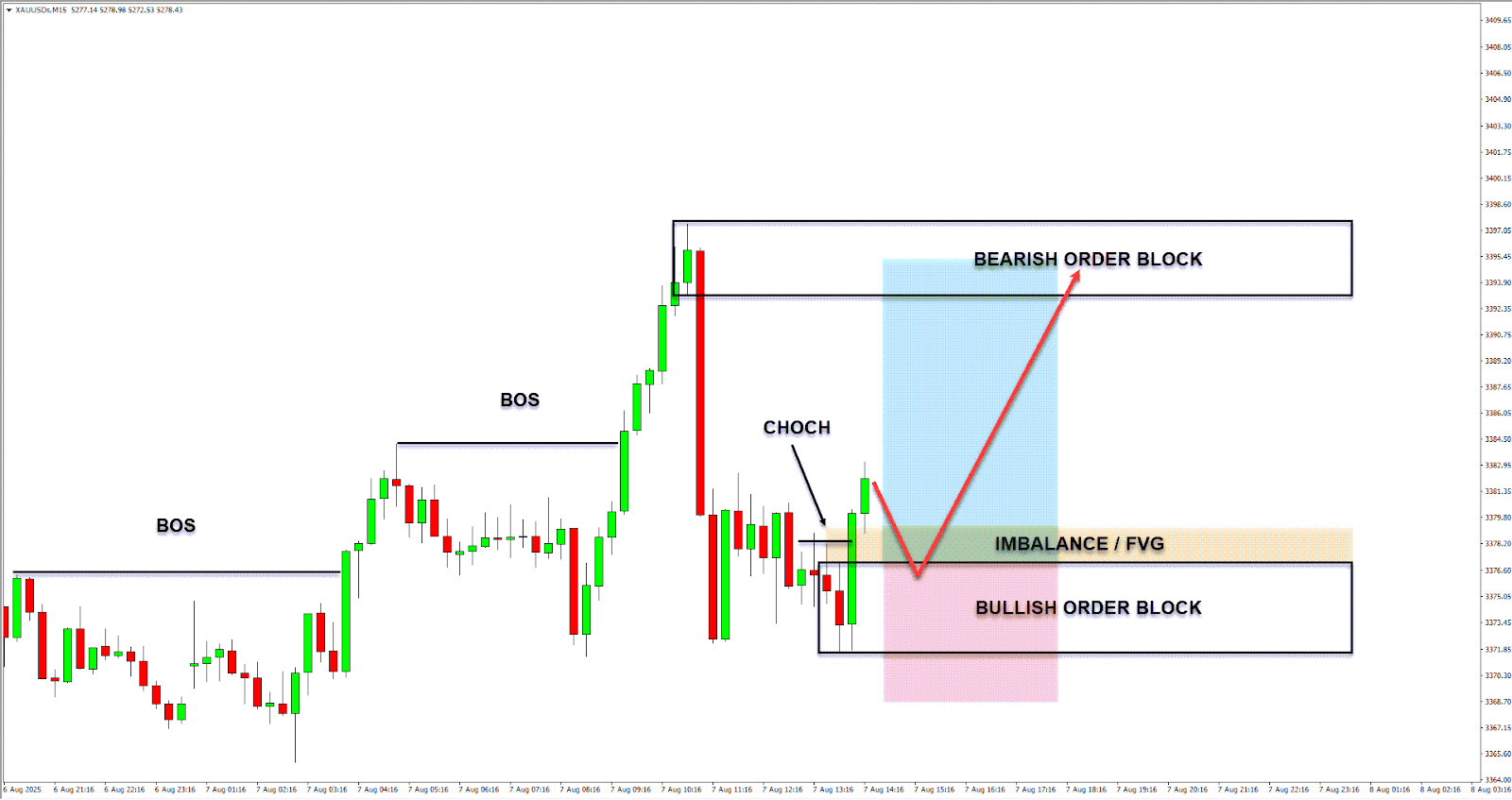 3. Setelah harga masuk ke area order block dan terdapat perubahan karakter (CHoCH) disana sekaligus terbentuknya area imbalance atau FVG.