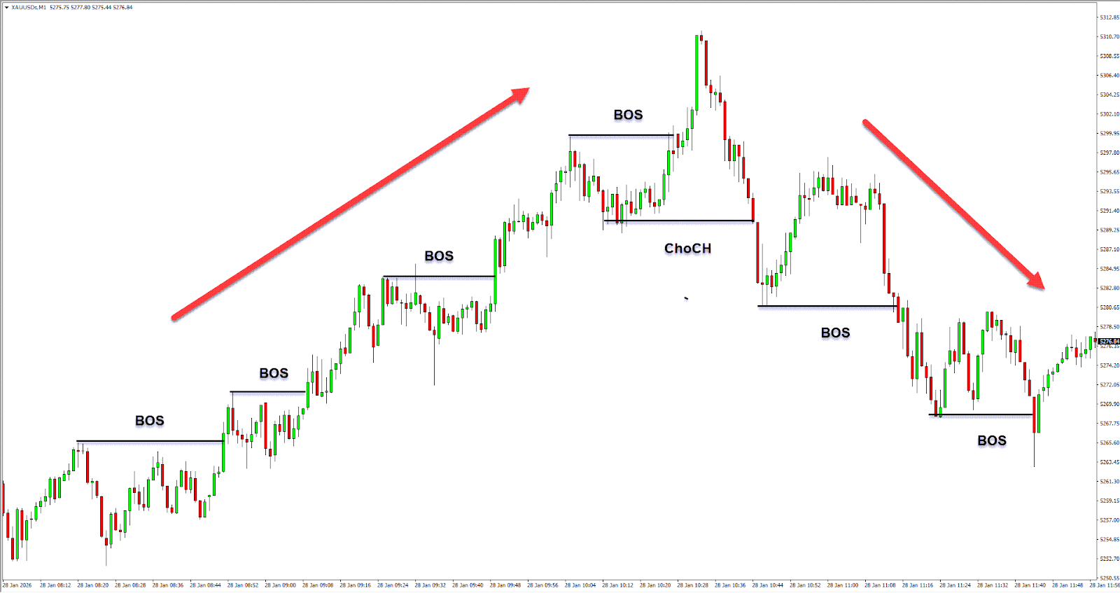 - BOS atau break of structure, yaitu penembusan struktur market. Misal harga terus menembus harga tertinggi sebelumnya menandakan trend naik. Sebaliknya jika harga terus menembus harga terendah sebelumnya artinya trend turun.