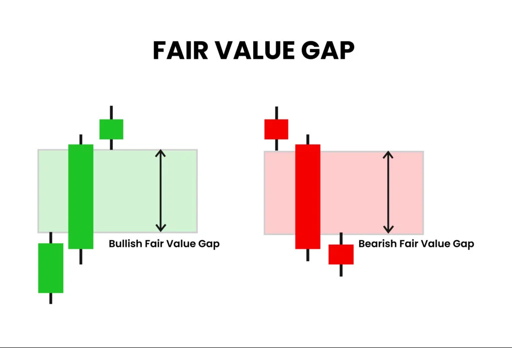 Setelah kita tau arah trend naik atau turun, kita bisa lanjutkan cari area yang bahasa kerennya itu “fair value gap” atau celah area yang terbentuk dari 3 formasi candle dan memiliki celah diantara candle pertama dan ketiga seperti ini.