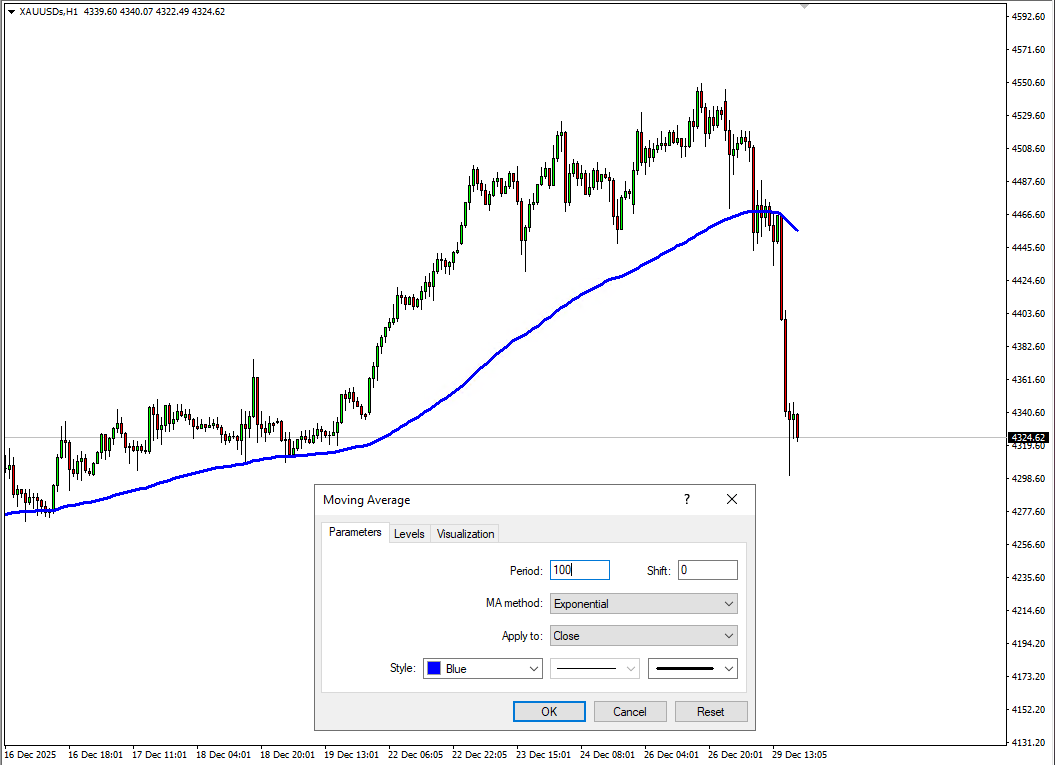 Untuk follow trend, kita bisa gunakan indikator bawaan platform metatrader yang sekiranya cocok traders gunakan. Misal exponential moving average, atau williams alligator, atau indikator trend apapun dengan settingan standard. Untuk langkah awal ini yang penting kita punya rules yang jelas untuk menentukan arah trend naik atau turun.