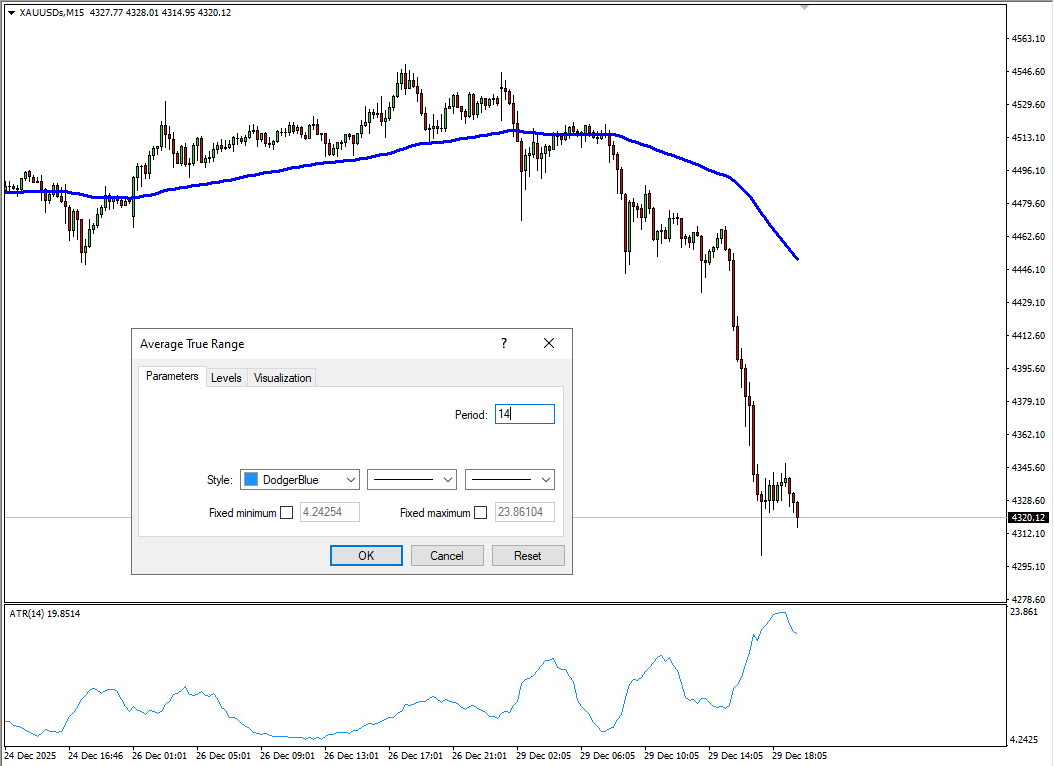 Lalu ada satu lagi indikator bernama average true range (ATR), yang bertujuan untuk melihat rata-rata rentang pergerakan harga. Bisa juga untuk menentukan target ataupun stop loss agar lebih objektif tidak terlalu jauh atau terlalu dekat. Misalnya untuk stop loss 2x ATR, sedangkan targetnya di 3x ATR-nya, dst.