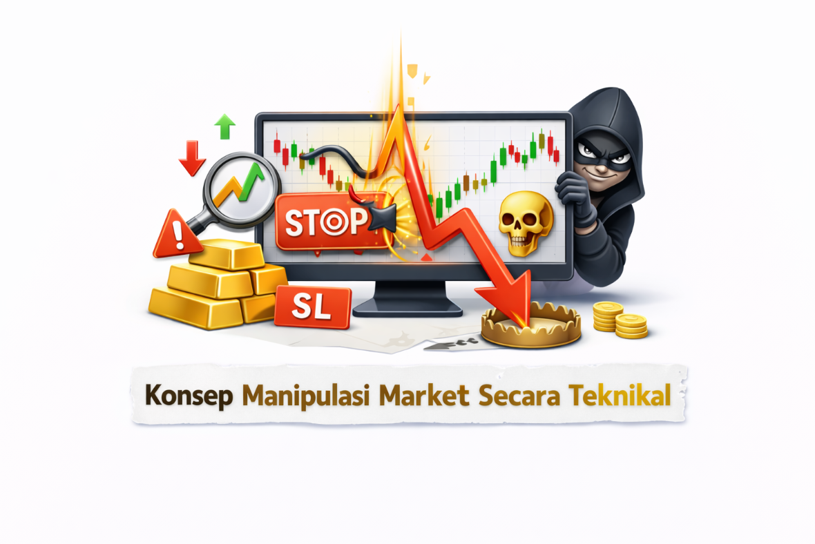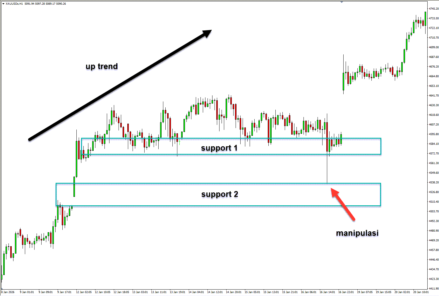 Kali ini kita akan bahas dari sisi konsep manipulasi market secara teknikal. Pergerakan emas memiliki karakteristik yang sering “memanipulasi”. Apa itu manipulasi market? secara sederhana kita gambarkan seperti ini, apabila emas sedang mengalami up trend tiba-tiba pergerakan harga secara cepat anjlok atau terlihat ada perubahan arah menjadi down trend. Padahal ini hanya membentuk spike saja pada chart.
