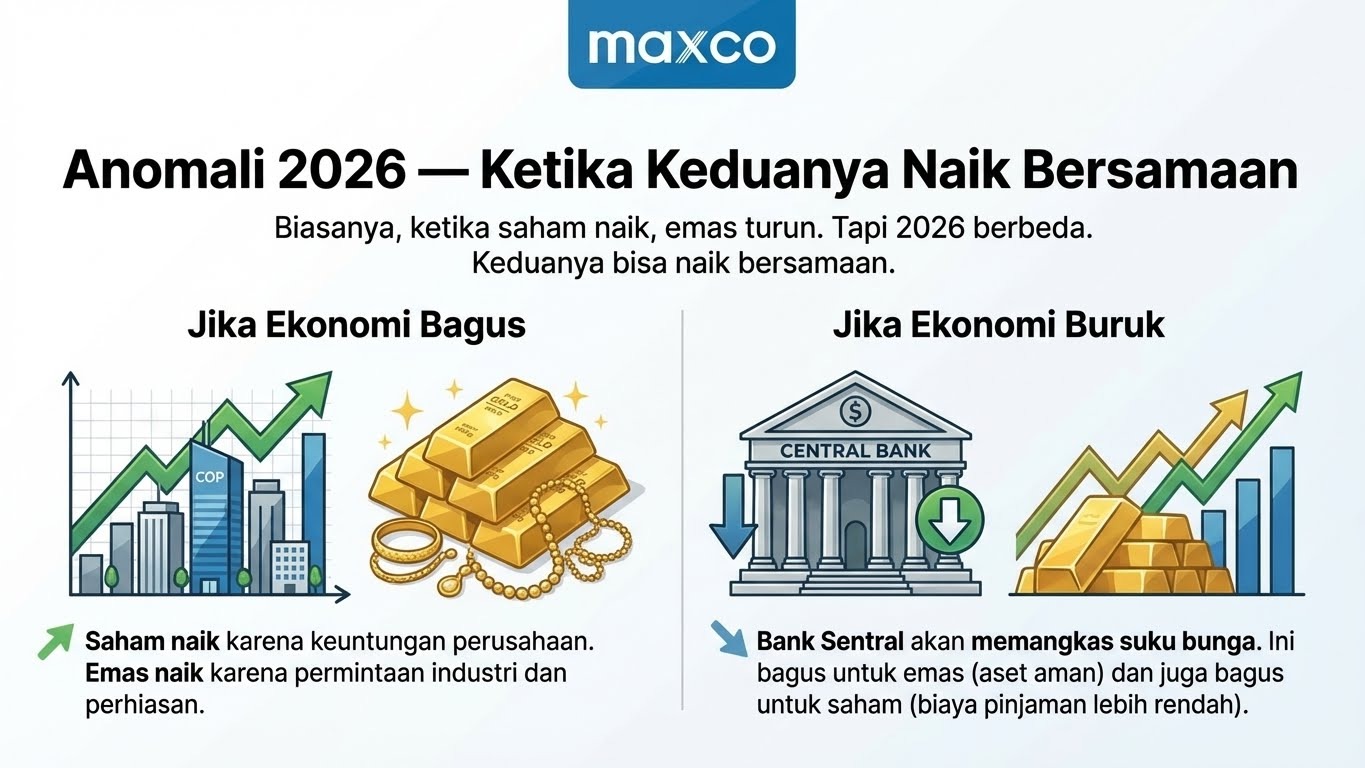 Biasanya, kalau saham naik, emas turun. Tapi 2026 berbeda. Keduanya bisa naik bersamaan.
