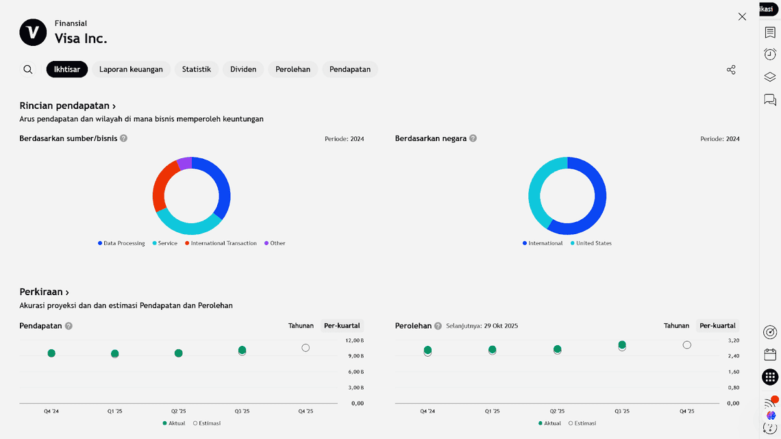 - Dalam 2 tahun terakhir, Visa hanya sekali gagal memenuhi estimasi pendapatan Wall Street — rata-rata kelebihan (beat) adalah sekitar 1,2%.