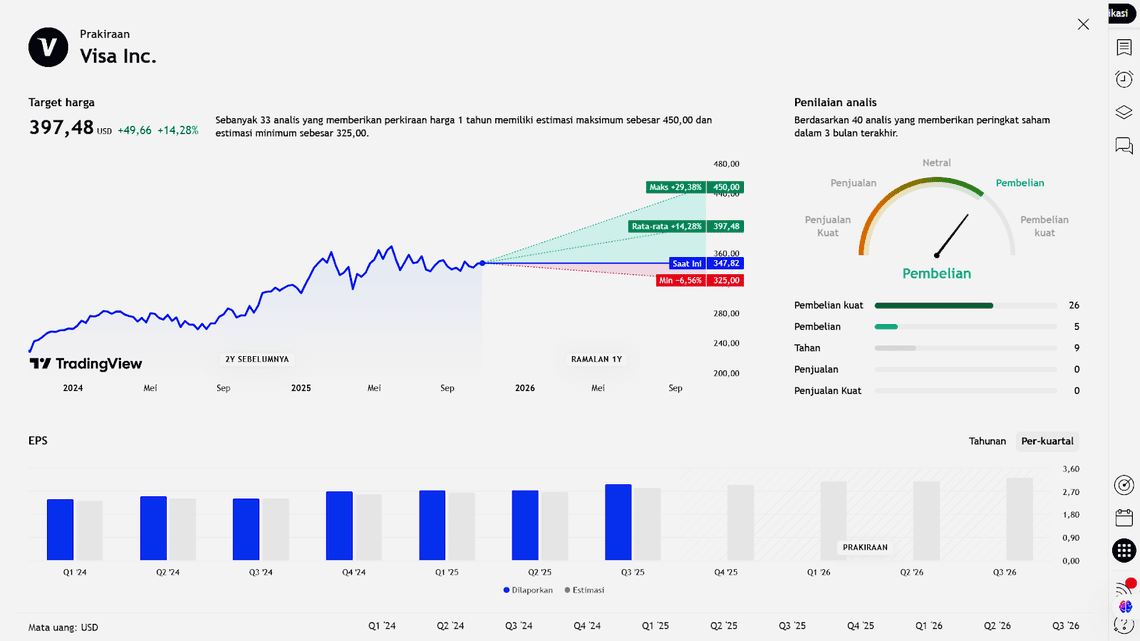 - Target harga rata-rata analis untuk saham Visa disebut sekitar US$392,59 dibanding harga saham saat artikel ditulis sekitar US$347,50.