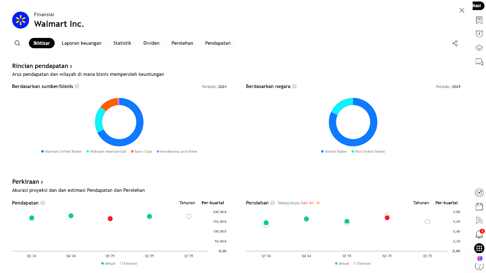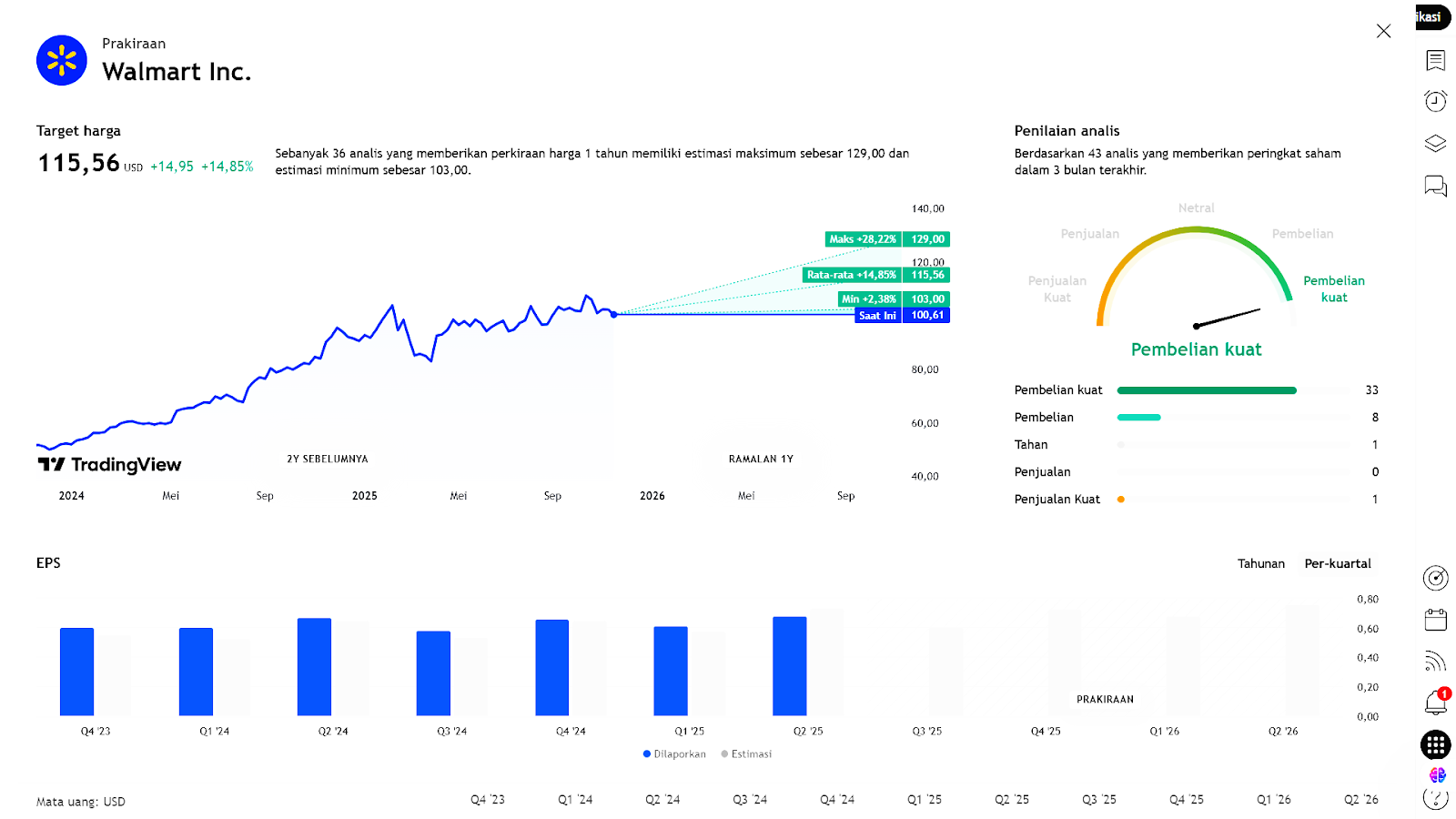 Walmart diperdagangkan pada valuasi premium dibanding retailer tradisional karena stabilitas bisnis dan pertumbuhan digitalnya. Namun, penyesuaian valuasi dapat terjadi jika margin mengecewakan atau jika perusahaan menurunkan proyeksi kinerja (guidance).
