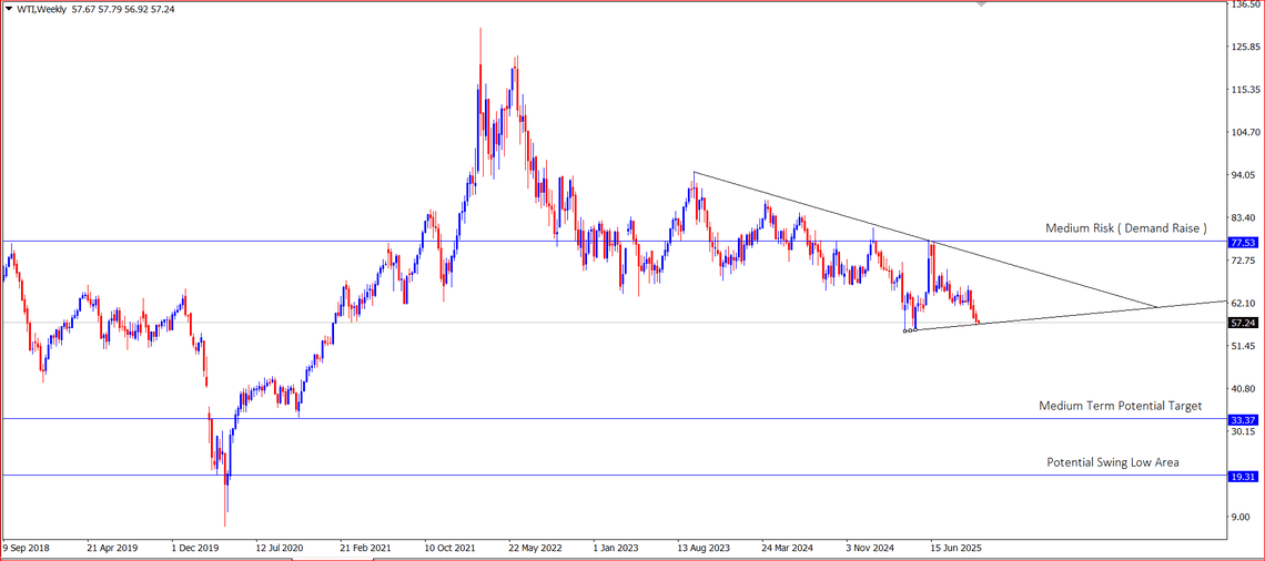Secara teknikal, tekanan terhadap WTI masih berlanjut dengan potensi penurunan jangka menengah di kisaran $33–34 per barel. Jika tekanan dan spekulasi meningkat tajam, kemungkinan muncul pola swing lower menuju area $20 juga terbuka.