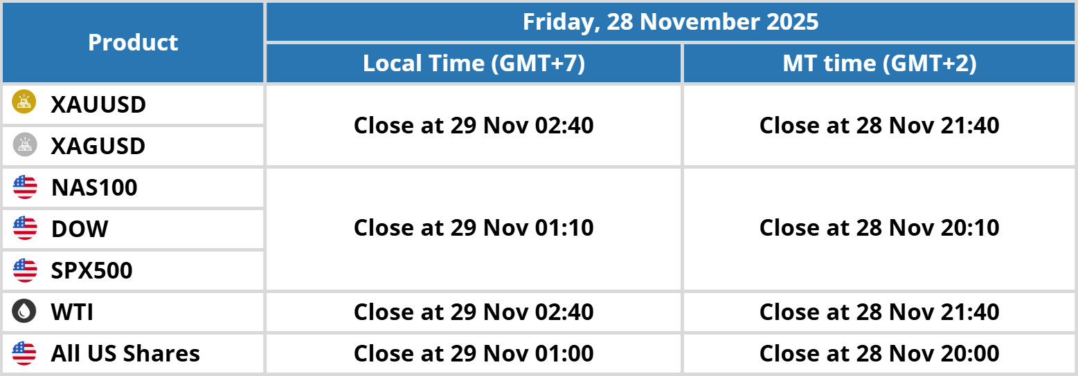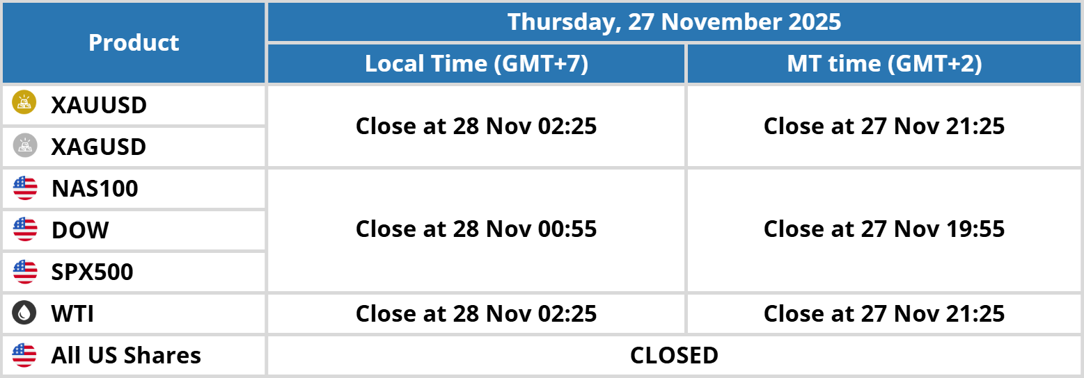 We would like to inform you that there will be a trading session update due to Thanksgiving Day. Please kindly record the date and time in the table below: