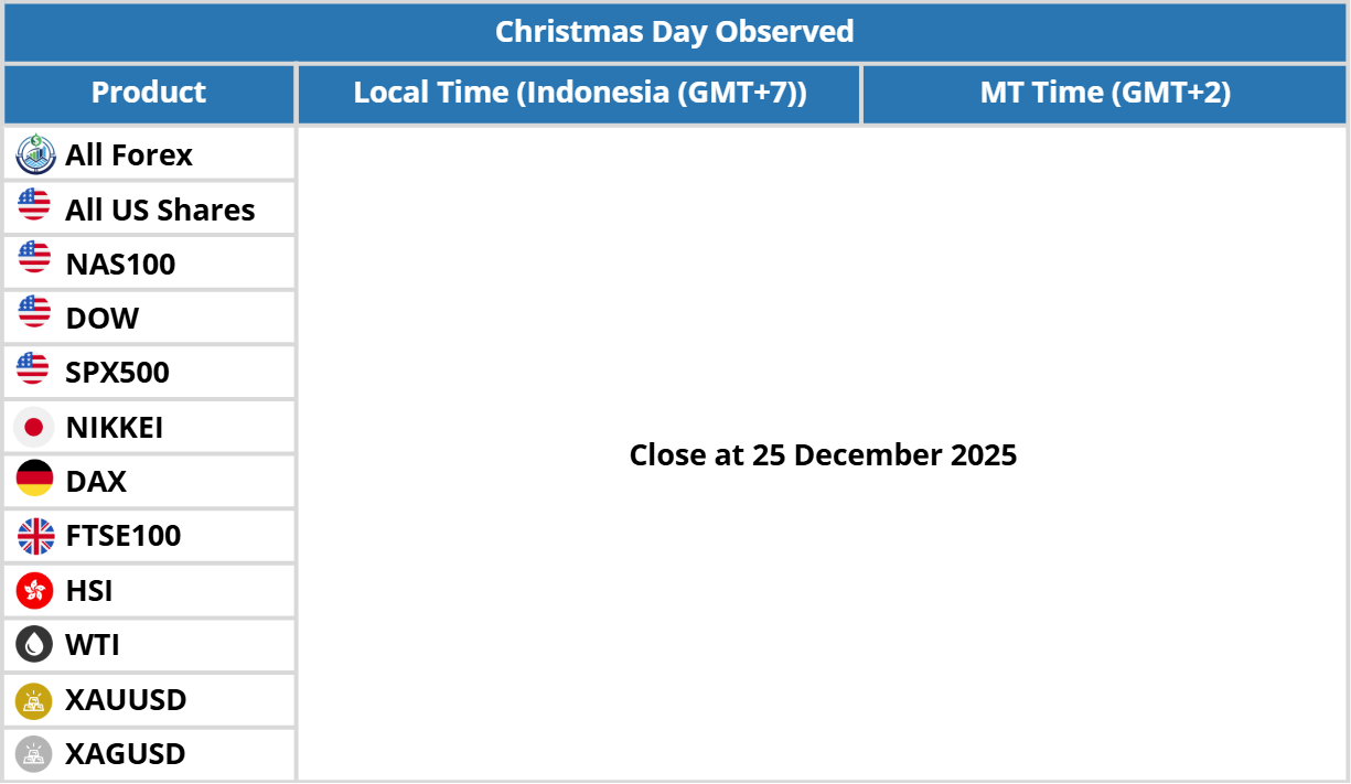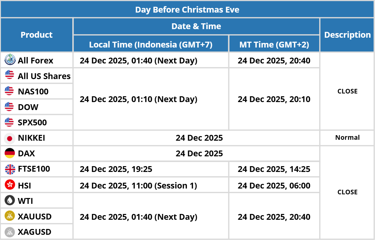 We would like to inform you that there will be an important market event due to Day Before Christmas Eve and Christmas Day Observed. Please kindly record the date and time in the table below: