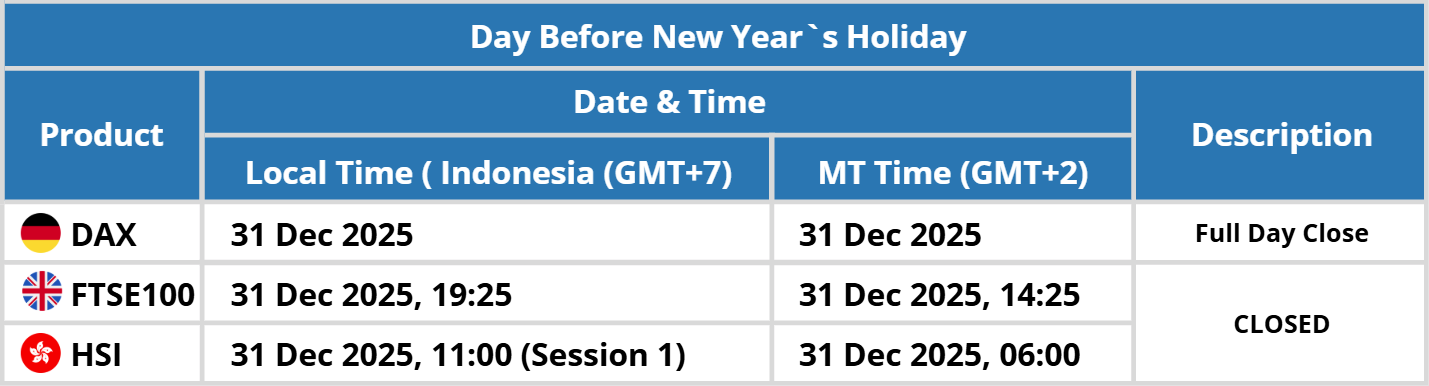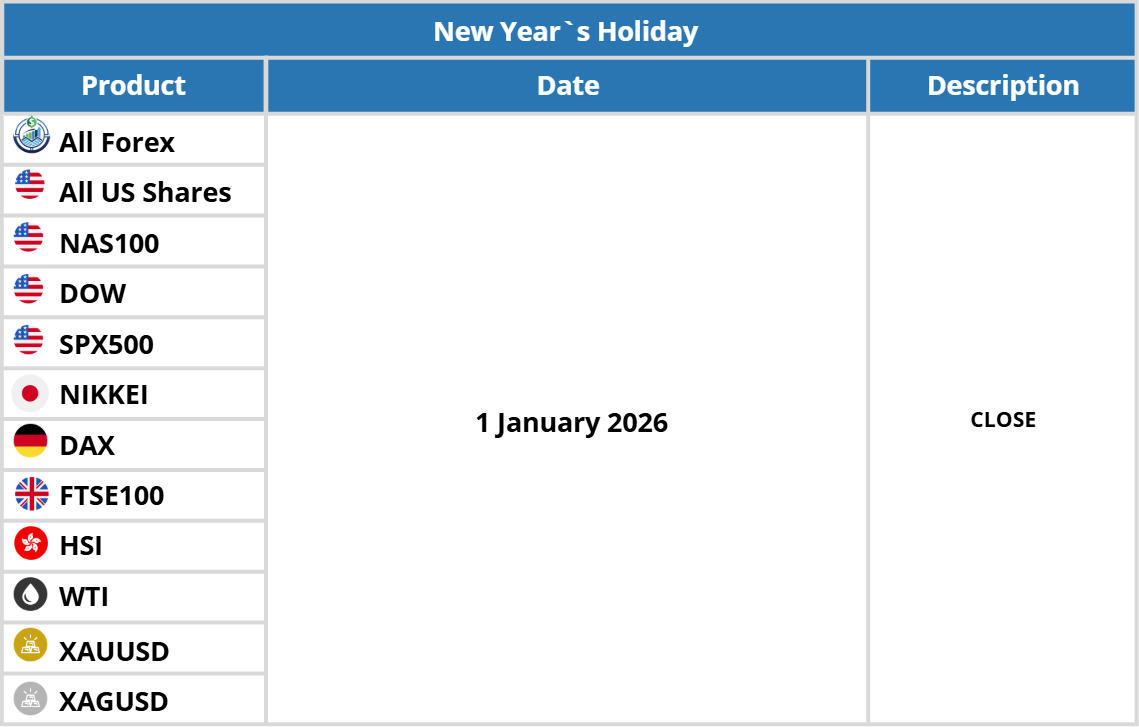 We would like to inform you that there will be an important market event due to Day Before New Year`s and New Year`s Holiday. Please kindly record the date and time in the table below: