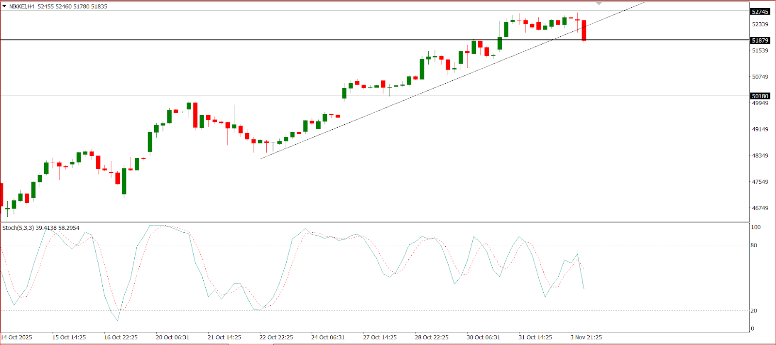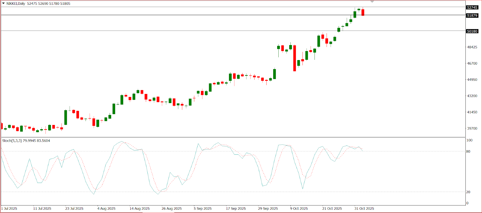 Several technical signals suggest that the index has rallied significantly and may now be entering an overbought or corrective phase. Oscillator indicators show that Nikkei 225 is approaching “overbought” territory, indicating potential short-term weakness.