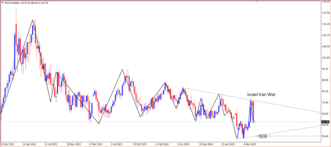 Currently, oil is expected to trade within a range of around $68 — a key short-term upward slope — and $72, which represents the 61.8% Fibonacci retracement level from the post-geopolitical spike. On the downside, the price range is seen near $57, aligning with the medium-term uptrend triangle formation. Weekly support levels are gradually positioned at $55.1 and $51.4, while the nearest resistance levels lie at $66 and $78.