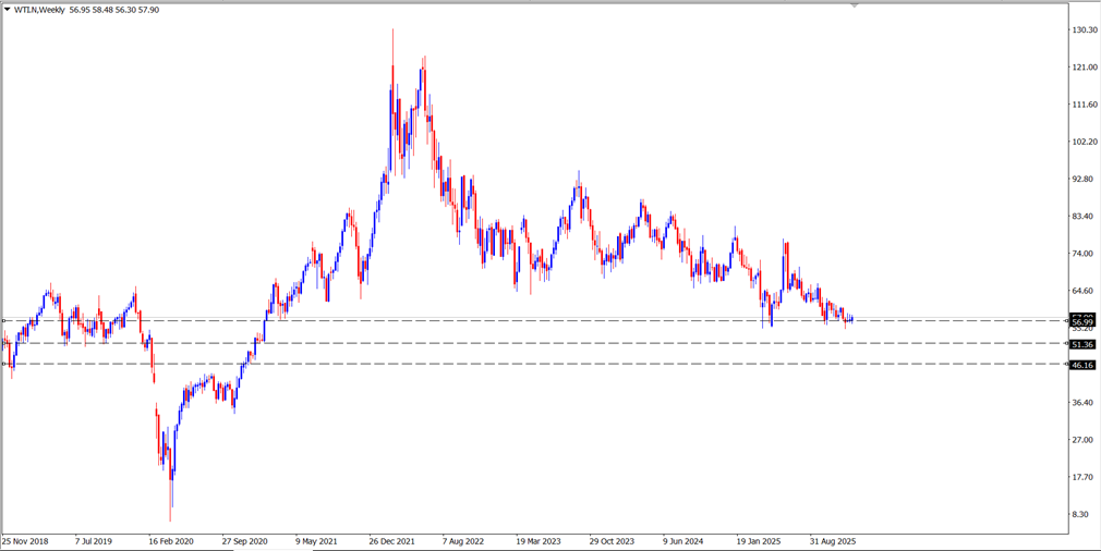 The weekly WTI chart continues to signal a bearish bias, with prices approaching a key support area around 54.8. A decisive break below this level would open the door for further downside, with subsequent support levels at 51.3 and 46.2.