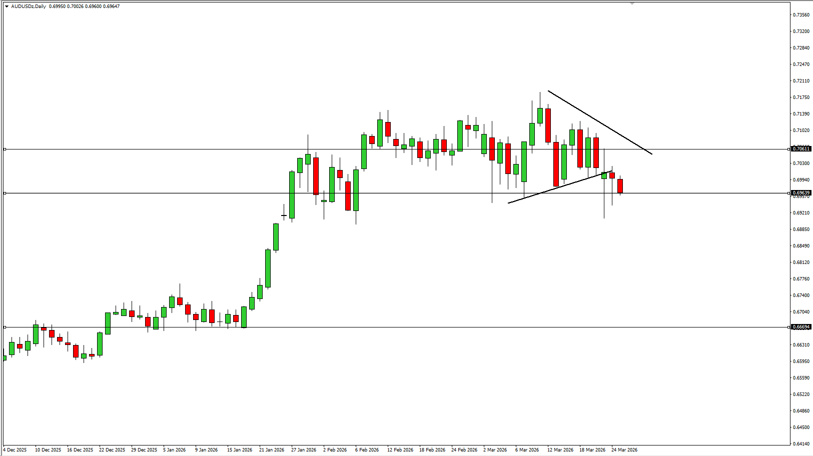 Gambaran Teknikal Pergerakan AUD/USD saat ini menunjukkan potensi pelemahan lanjutan, setelah harga berhasil menembus area support dan membentuk pola bearish pennant. Pola ini merupakan continuation pattern yang mengindikasikan adanya fase konsolidasi sebelum harga melanjutkan tren turun. Sinyal bearish diperkuat oleh: Selama harga tetap berada di bawah area support yang telah ditembus, maka peluang penurunan lanjutan […]
